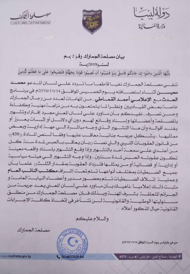 نفت مصلحة الجمارك ما تردد على لسان أحد ضيوف قناة الحدث التابعة لحفتر بشأن اتهامات لعدد من القيادات بمصلحة الجمارك ، مضيفة أن كل ما ورد في اللقاء كان محض افتراء وغير مقترن بأي دلائل.