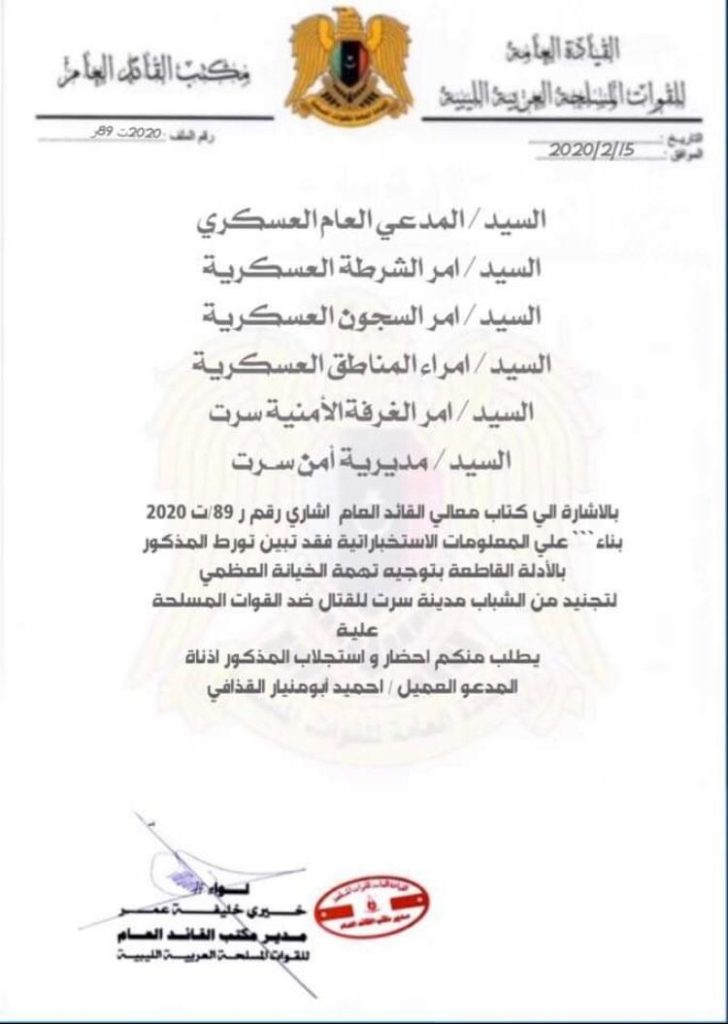 وجاء في مذكرة القبض التي وجهت إلى الجهات الأمنية والعسكرية في مدينة سرت، الأمر بضبط “إحميد القذافي” لمشاركته في تجنيد شباب سرت للقتال ضد مليشيات حفتر، بحسب المذكرة.