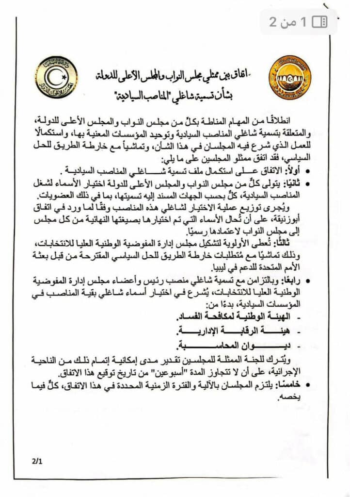 وبحسب نص الاتفاق، يتولى كل من مجلس النواب والمجلس الأعلى للدولة اختيار الأسماء المرشحة لتولي المناصب السيادية وفق معايير محددة، على أن تُحال الأسماء النهائية إلى مجلس النواب لاعتمادها رسميًا.