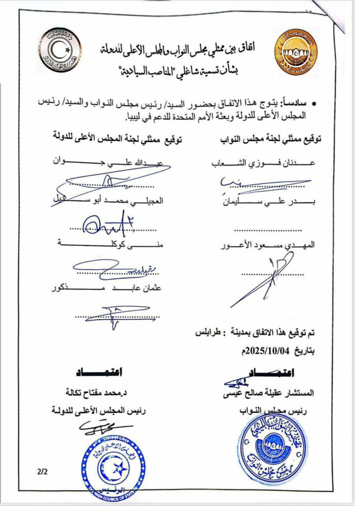وقع ممثلون عن مجلس النواب والمجلس الأعلى للدولة اتفاقًا في العاصمة طرابلس، بشأن استكمال ملف تسمية شاغلي المناصب السيادية، بحضور رئيسي المجلسين والممثلة الخاصة للأمم المتحدة في ليبيا.